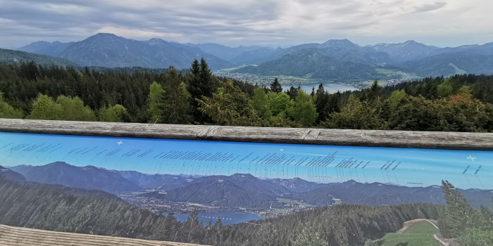 Kurz vor der Hütte lichtet sich der Wald und es eröffnen sich erste freie Blicke auf den Tegernsee und die umliegenden Berge.